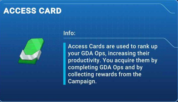 These access cards play a crucial role in boosting the productivity of your GDA ops. By using access cards to rank up your operations, you can significantly improve their efficiency, leading to the potential for increased rewards and resources. Strategic application of access cards is essential for maximizing the benefits for your overall progress and success in the game.