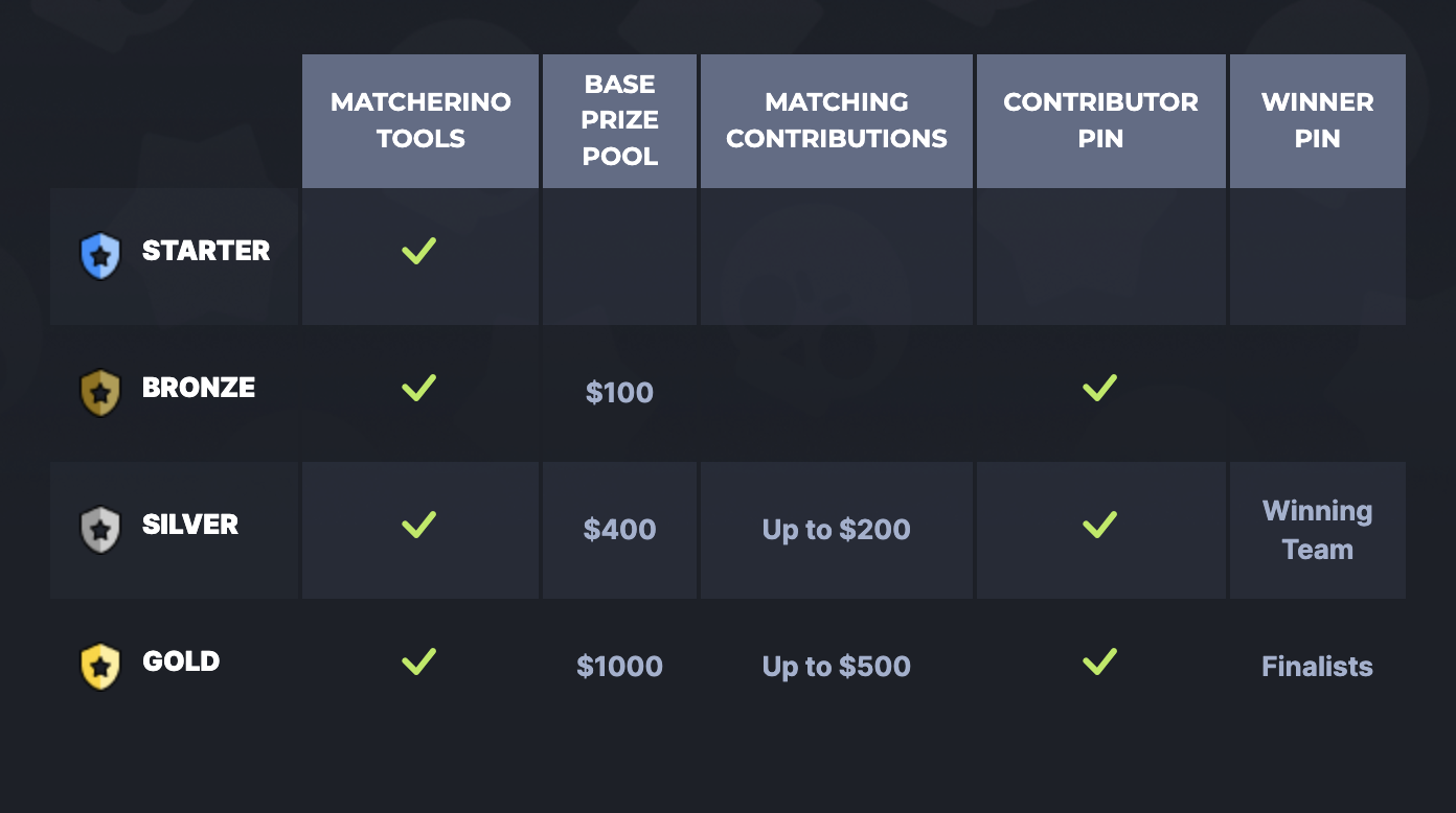 Todos los niveles reciben el conjunto de herramientas matcherino para ejecutar eventos sin problemas, mientras que los eventos de niveles superiores son elegibles para recompensas adicionales. Los organizadores deben enviar una solicitud para cada evento con el fin de recibir premios base, coincidencia de contribuciones y recompensas de pines en el juego.