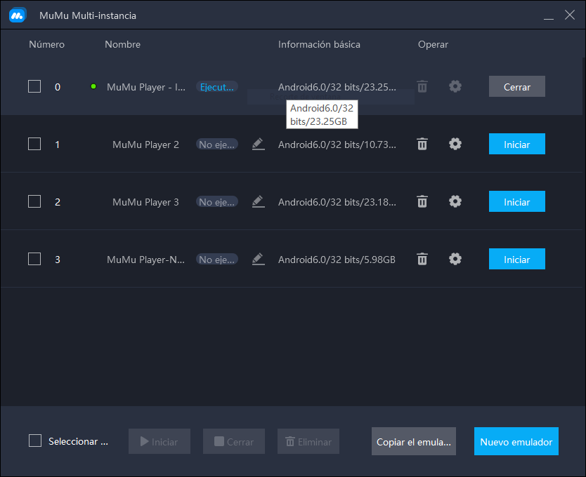 Nota: Copiar el emulador significa que copiar los juegos y archivos en el emulador que seleccionó al disco donde está instalado MuMu, asegúrese de que su espacio en el disco sea suficiente; crear un nuevo emulador significa "instalar" un emulador nuevamente, lo que solo incluye las funciones y aplicaciones predeterminadas del emulador;