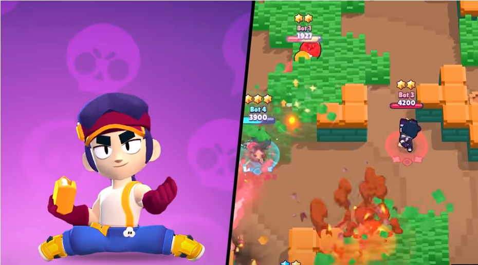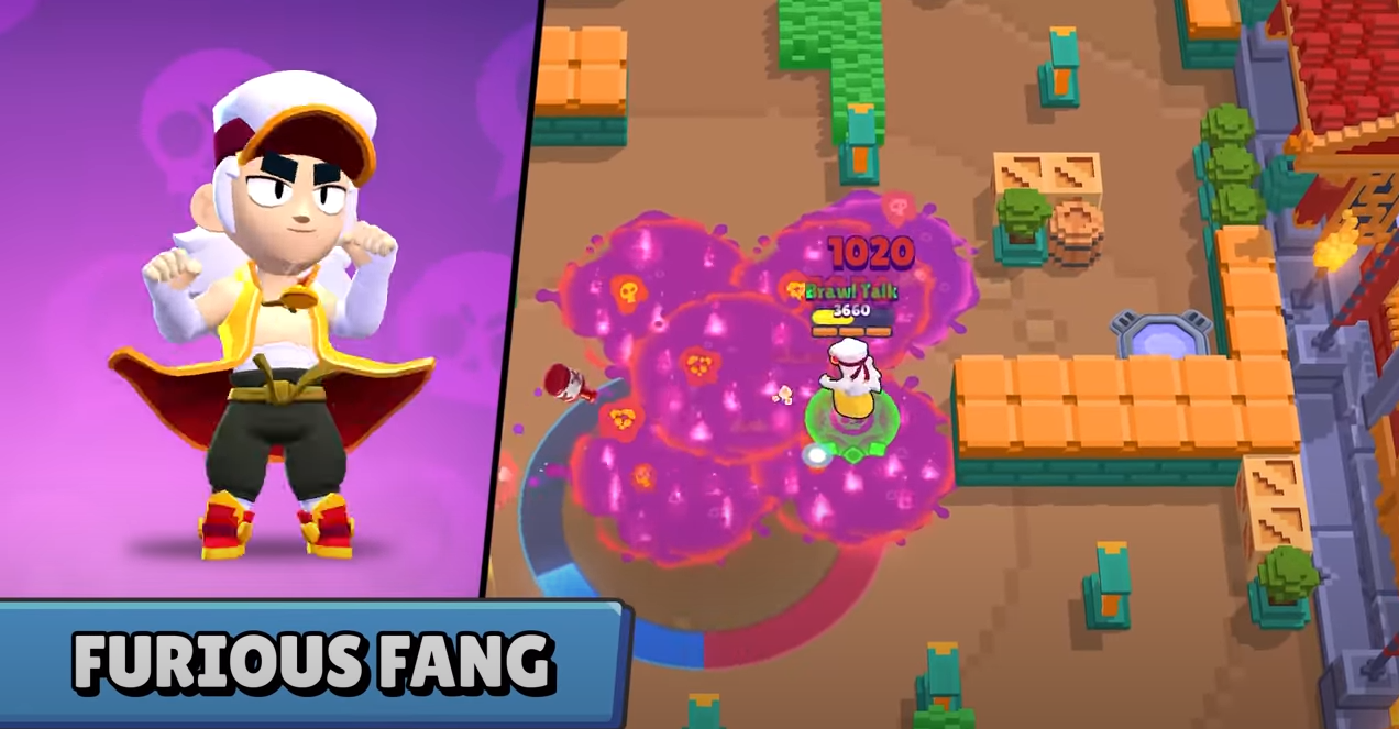 Su súper es bastante diferente. Da una potente patada voladora que si impacta a un rival, conectará con otro objetivo que se encuentre en el alcance del súper de Fang. Esto lo hace hasta cuatro veces. Podría acabar con un equipo entero si se usa en el momento exacto. Como Fang es el brawler cromático de la actualización, contará con un aspecto en la última marca del Brawl Pass. El aspecto se llama Fang furioso.