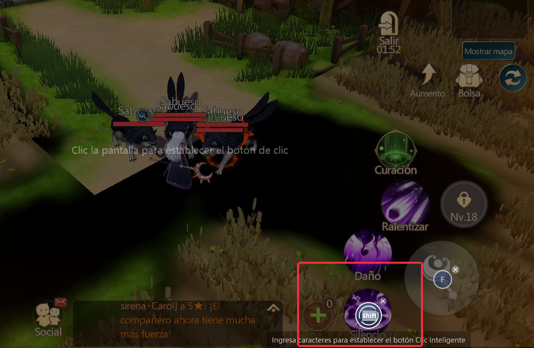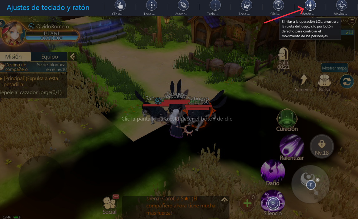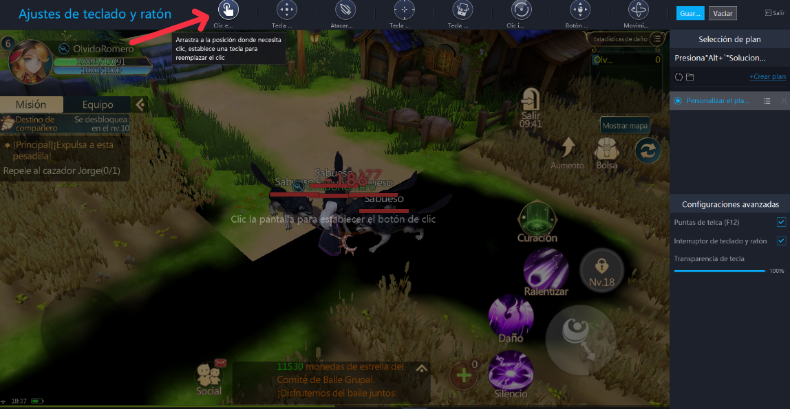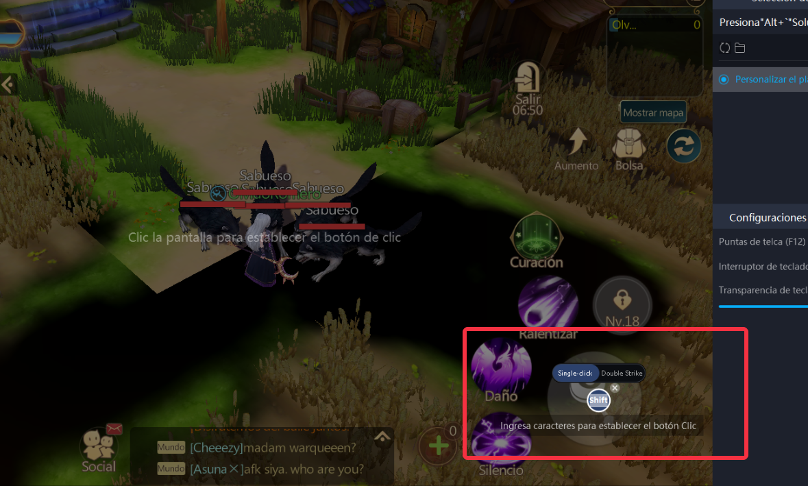 Mantenga presionado el botón y arrástrelo a la pantalla del juego (o haga clic directamente en la pantalla del juego con el botón izquierdo) en el panel de ajuestes de teclado y ratón, por último ingresa caracteres para establecer el botón Clic (como F).