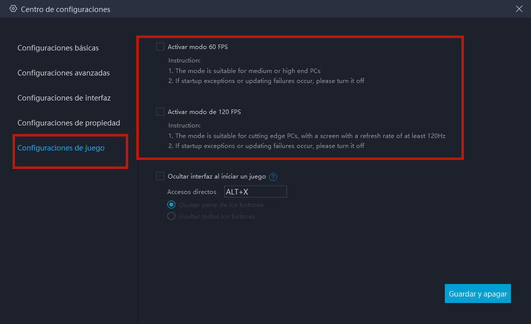 ③ Acceda a "Centro de configuraciones" en la ventana superior derecha del emulador → "Configuraciones de juego" → Seleccione "Activar Modo de 120 FPS"