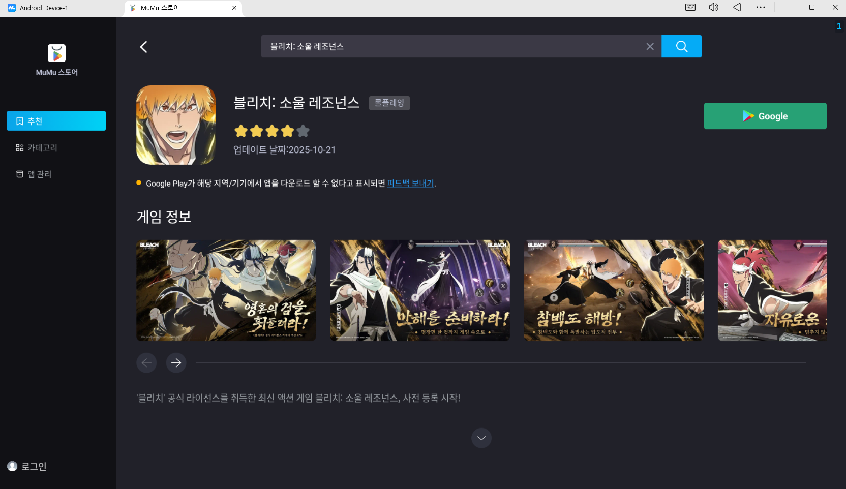 뮤뮤 앱플레이어(MuMuPlayer)에서 블리치: 소울 레조넌스 PC 버전 다운로드 및 설치 가이드