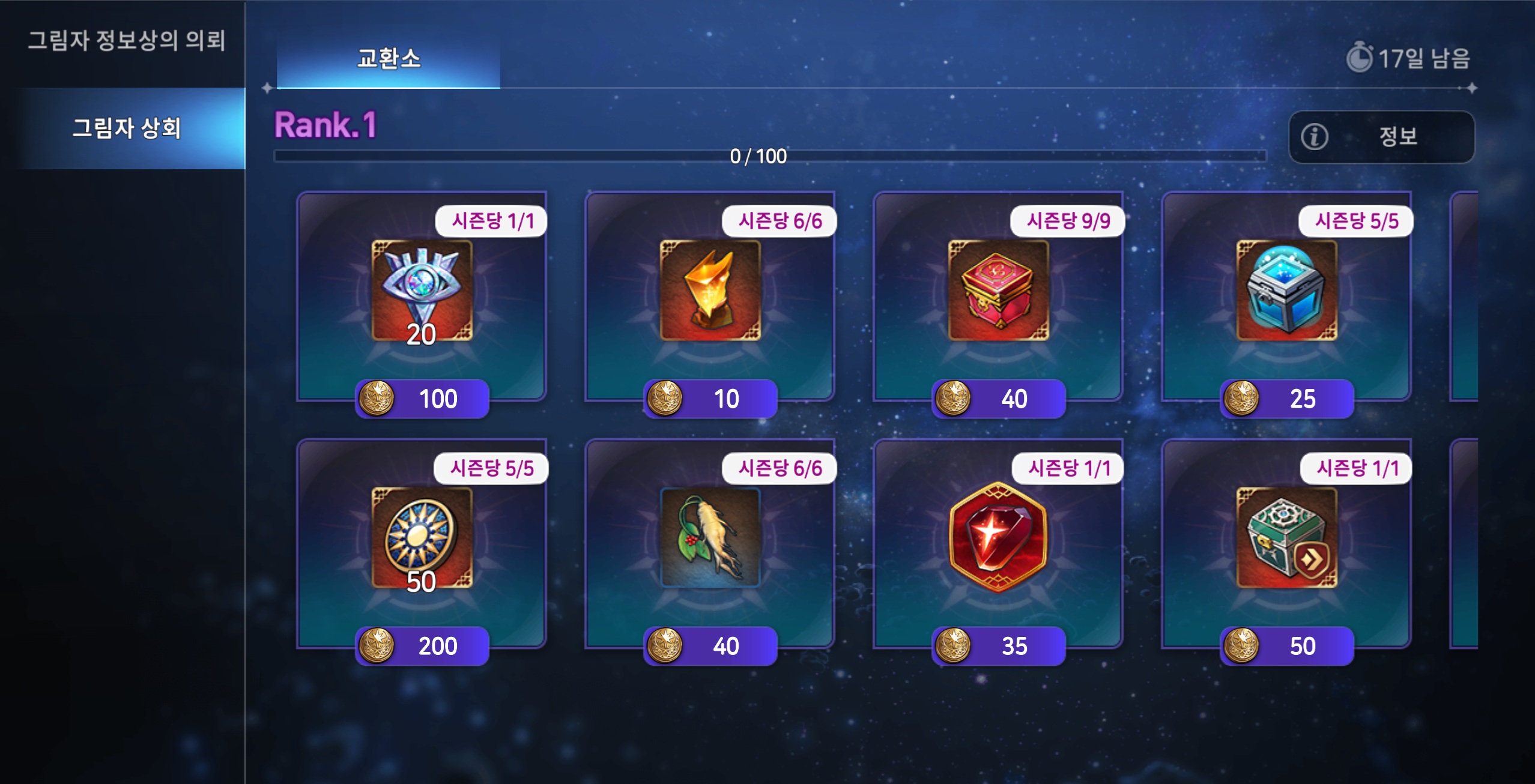 - 그림자 정보상의 의뢰와 의뢰 보상을 통해 획득한 [그림자 주화]로 원하는 아이템을 구매할 수 있습니다.
