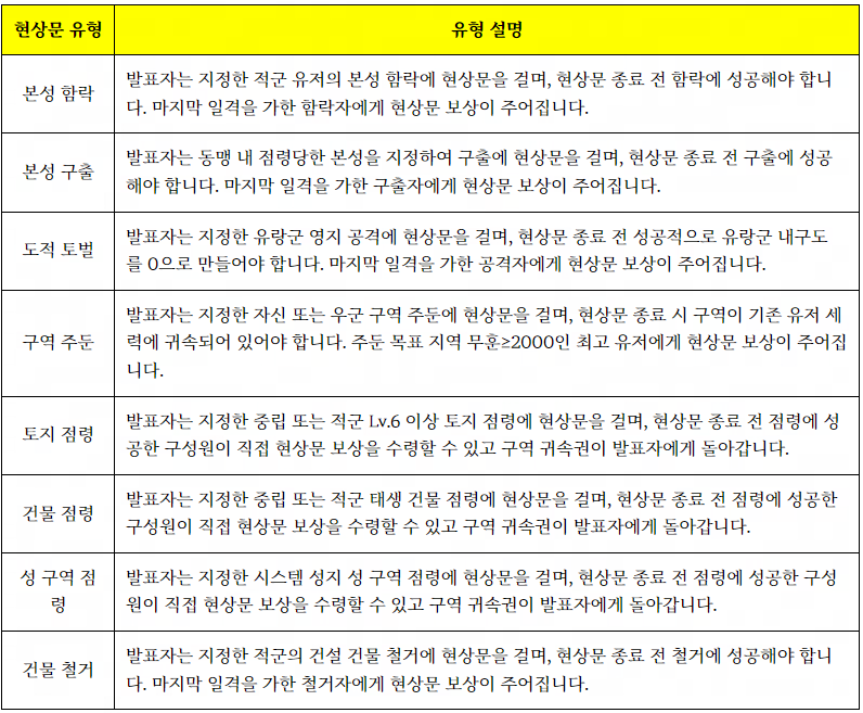 - 카운트다운 동안 동맹/단체 내 이번 시즌 개인 역대 최고 세력치≥5000인 구성원은 현상문을 완료할 수 있지만, 인당 매일 최대 3회로 제한된다. 카운트다운 종료 전 해당 현상문 목표를 완료했을 경우 현상문의 옥패 보상을 획득할 수 있다.