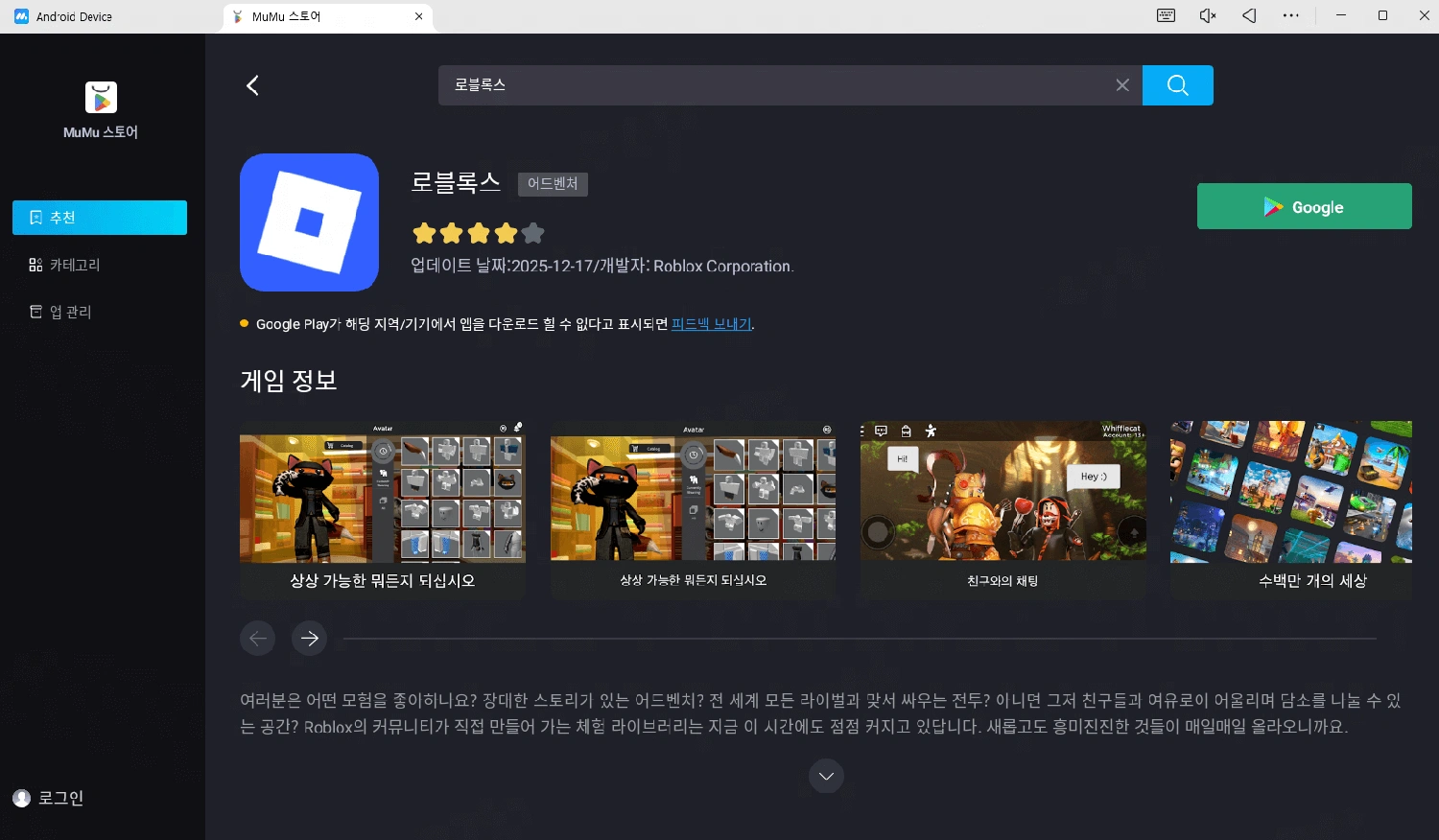 이 단계들을 완료하는 데 몇 분밖에 걸리지 않으며 이후에는 MuMuPlayer가 제공하는 최고의 컨트롤, 그래픽, 성능 및 기타 뛰어난 기능을 통해 PC에서 로블록스를 즐기게 됩니다. 이제 MuMuPlayer로 PC에서 흥미진진한 로블록스 세계 속 플레이 경험을 시작하세요.