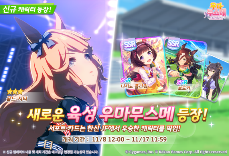 카카오게임즈(대표 조계현)는 8일, ㈜사이게임즈(대표 와타나베 코우이치)가 개발한 인기 모바일 게임 ‘우마무스메 프리티 더비’에 신규 육성 우마무스메 ‘골드 시티’를 공개했다.