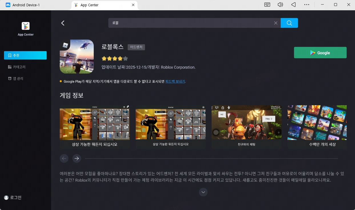 앱플레이어 실행 후 Google Play에 로그인 → 로블록스 검색 및 설치