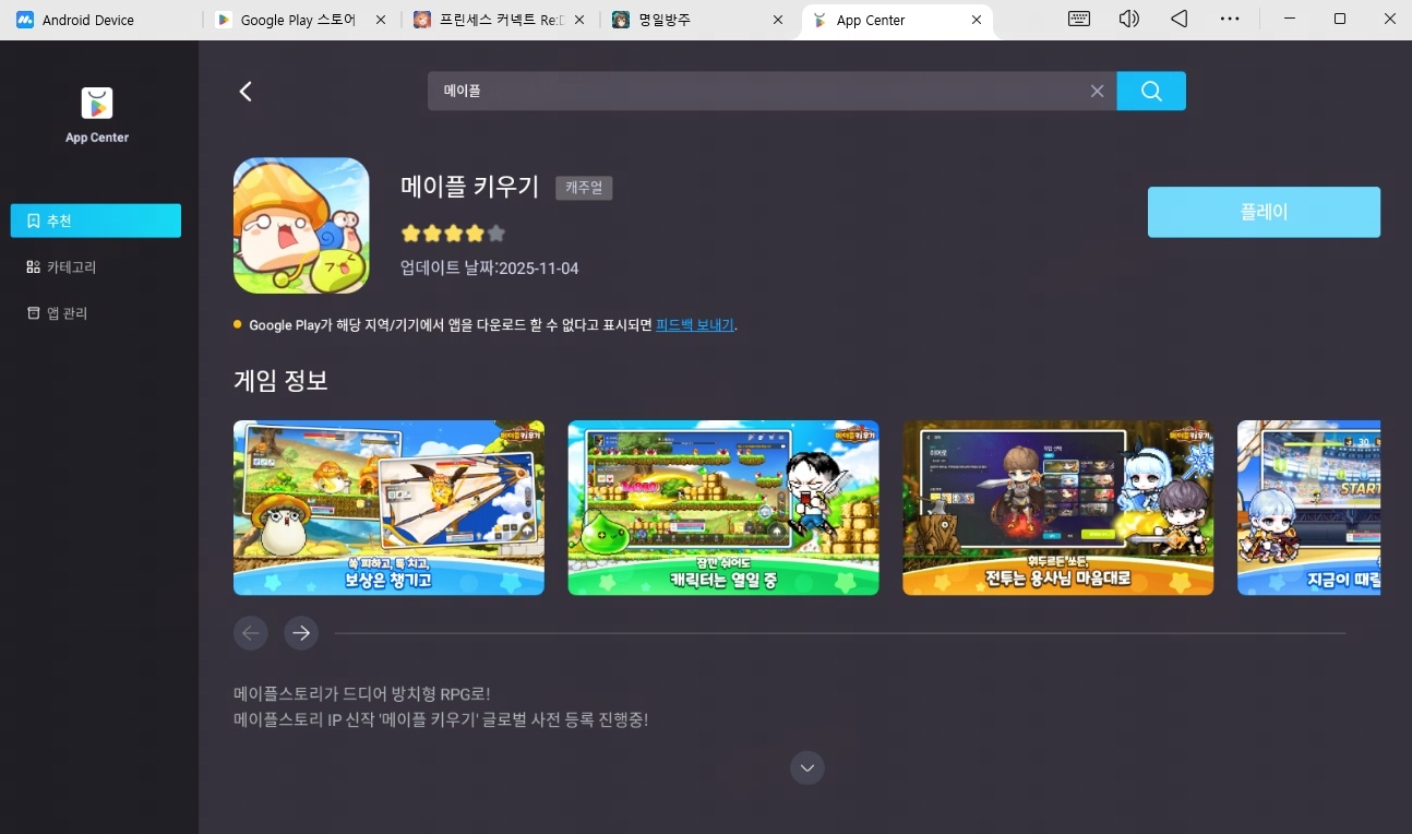 앱플레이어 실행 후 Google Play에 로그인 → 메이플 키우기 검색 및 설치