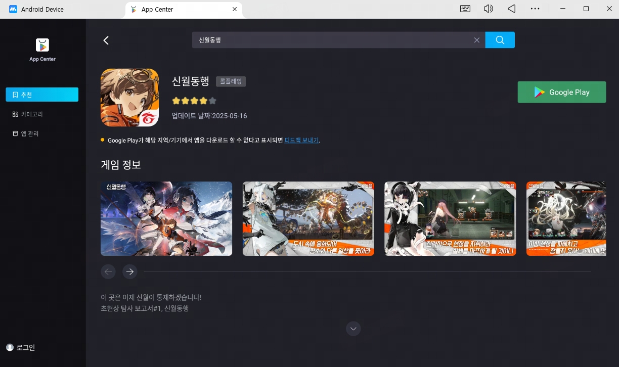 앱플레이어 실행 후 Google Play에 로그인 → 신월동행 검색 및 설치