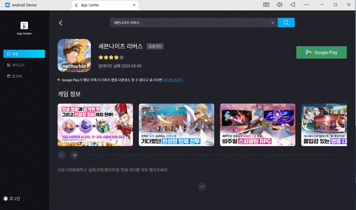 앱플레이어 실행 후 Google Play에 로그인 → 뱀피르 검색 및 설치