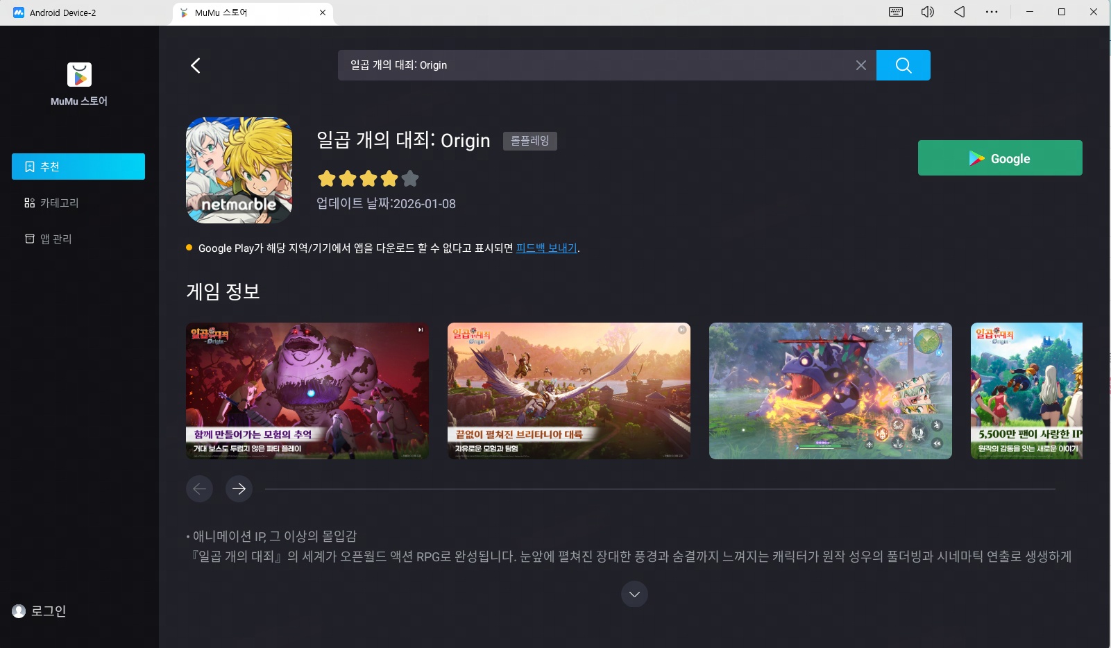 앱플레이어 실행 후 Google Play에 로그인 → 일곱 개의 대죄: Origin 검색 및 설치
