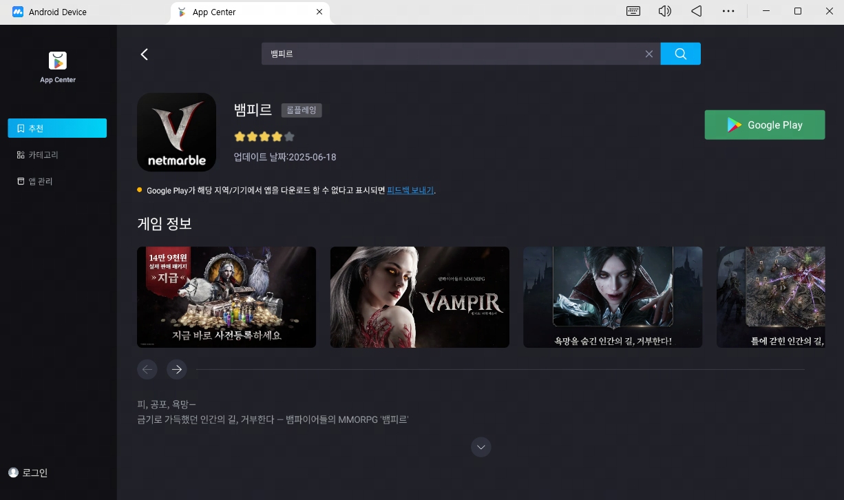 앱플레이어 실행 후 Google Play에 로그인 → 뱀피르 검색 및 설치