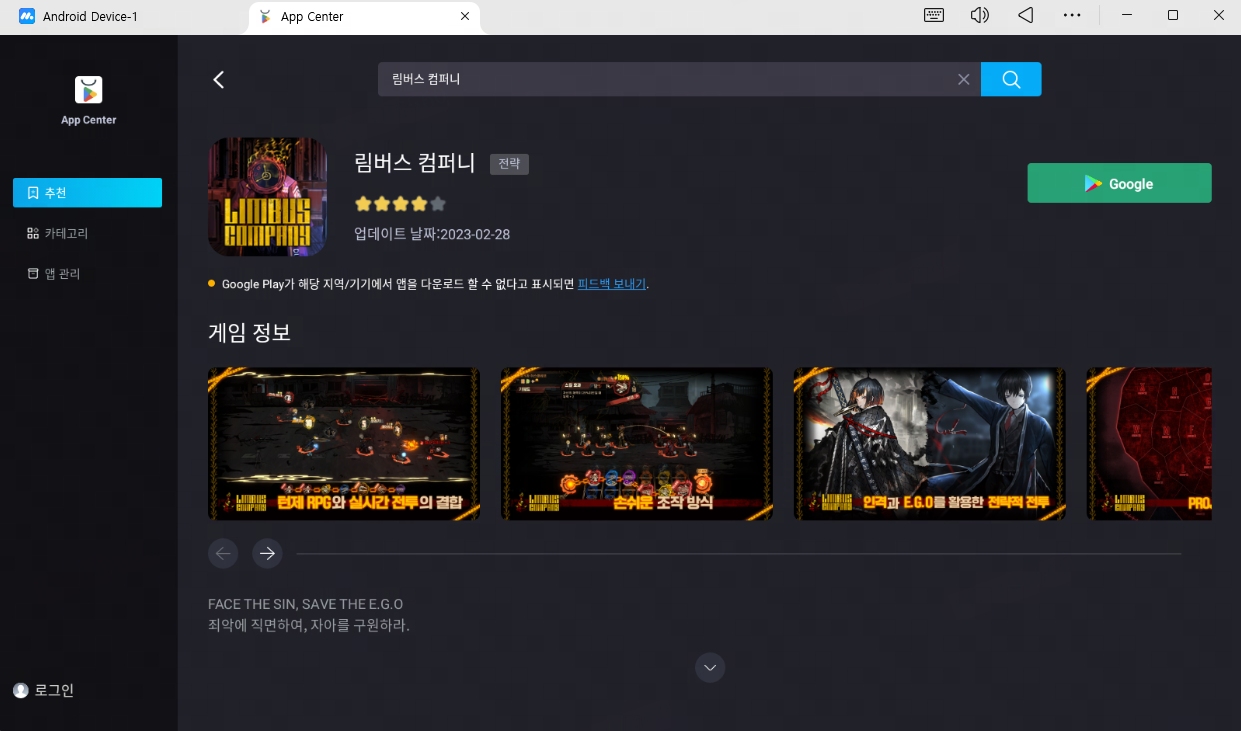 앱플레이어 실행 후 Google Play에 로그인 → 림버스 컴퍼니 검색 및 설치