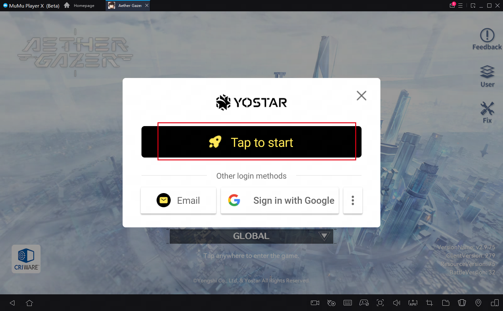 - Inicie o Aether Gazer e faça login com uma conta de convidado