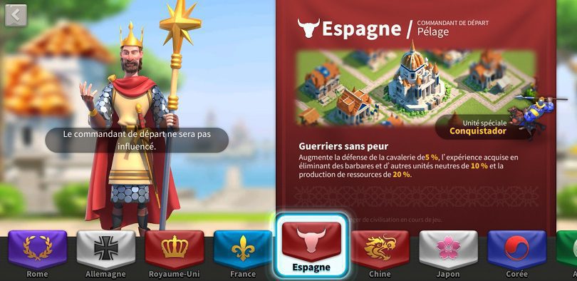 Sobre a mudança em si, você também pode mudar para uma nova civilização quando sua aliança não tiver um tipo específico de exército. Por exemplo, se a sua aliança não tiver uma cavalaria muito desenvolvida, você pode decidir mudar para a Espanha, que se destaca a cavalo com seus bônus. Isso permitirá que você reequilibre as forças de combate e facilite o progresso de sua aliança. Disseram-me que isso faria de você um estrategista sábio.