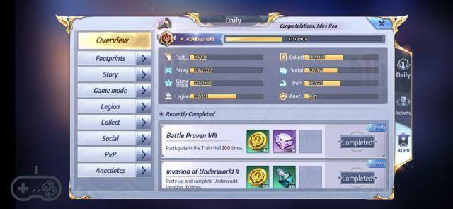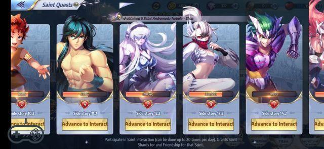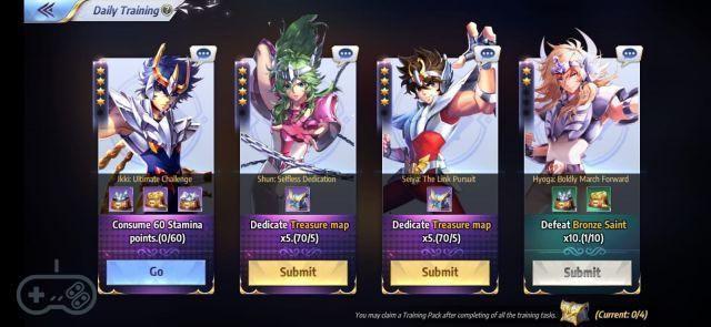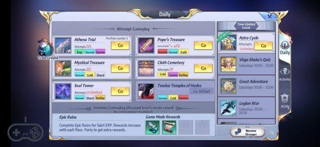 As atividades a serem realizadas no jogo são realmente muitas e é normal que os jogadores de primeira viagem se percam e gastem recursos (que mais tarde se mostrarão valiosos) incorretamente. Depois de atingir o nono sentido, será muito importante (os benefícios virão apenas mais tarde) para todos os novos jogadores, concentrar-se nos primeiros pilotos da classe B e A com muita moderação. Para o nosso estilo de jogo, será importante não elevar imediatamente ao máximo os níveis do nosso primeiro Santo, mas será fundamental apenas aumentar quando você não conseguir contornar as missões principais e secundárias do título.