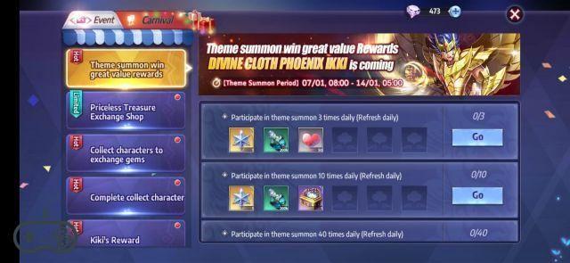 Entrando no menu no canto superior direito de Eventos, você acessará inúmeras missões, que mudam e expiram de acordo com o “banner” do momento. Girando ao longo dos meses, os jogadores poderão "gastar" Gemas Avançadas para tentar a sorte e coletar o personagem ou personagens do estandarte que você nunca encontraria em convocações ocasionais. Ligadas aos personagens, existem várias missões com atividades para fazer. Não digo para fazer todos, também porque os que dizem respeito ao "Refinar" do Cosmos são inicialmente inúteis, mas tentar fazer o máximo possível ajuda a ganhar vários "Diamantes".