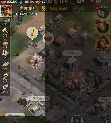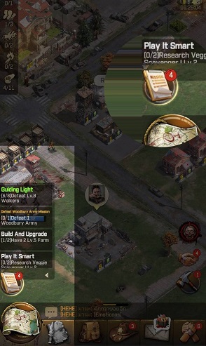 A guia de produção na fila ociosa mostra a lista de sobreviventes atribuídos ou ociosos. Olhe ao redor dos prédios da cidade e você encontrará árvores, arbustos. Toque nessas árvores ou arbustos para coletar recursos. Você pode atribuí-los aos blocos de recursos no mapa para aumentar a produção de recursos; fazenda de vegetais, serraria, lago, campo de caça e um acampamento do exército.