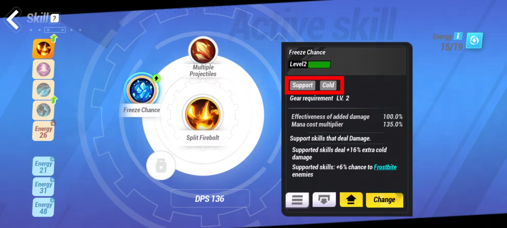 Como um novo jogador, sempre preste atenção à sua habilidade de suporte vinculada. Você pode potencialmente adicionar utilidade a uma habilidade ativa e aumentar a potência do dano. Um exemplo é adicionar 'Chance de Congelamento', que traz utilidade e dano; Uma habilidade de dano por frio fornece uma pequena oportunidade de adicionar um efeito lento ao atingir seus inimigos, ao mesmo tempo em que causa dano extra de frio.