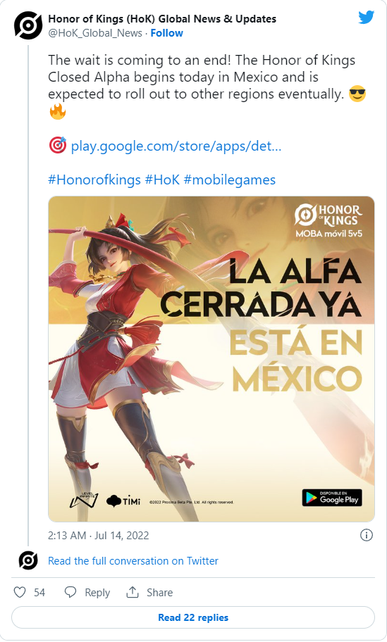 Honor of Kings — самая прибыльная игра в жанре MOBA с более чем 100 миллионами активных игроков в день, и теперь, наконец, начинается альфа-тестирование глобальной версии игры, начиная с Мексики. Игра была разработана TiMi Studios и издается Level Infinite. Альфа-версия игры пока запущена только в Мексике и скоро будет доступна в других регионах.