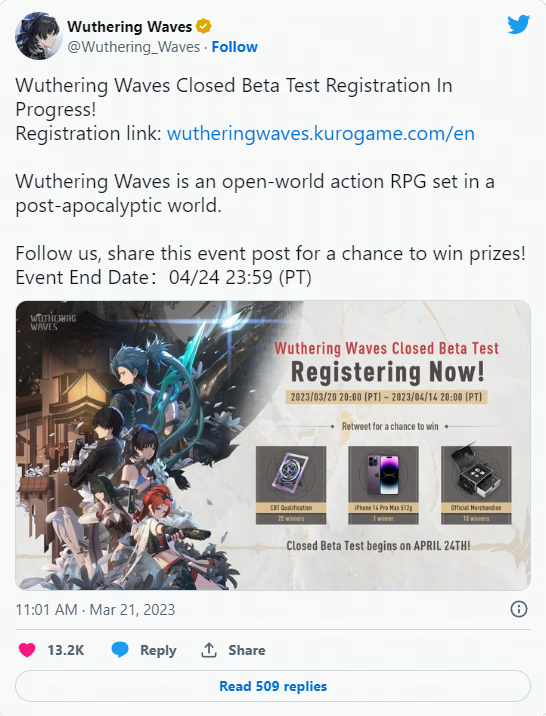 Долгожданная мобильная ARPG Wuthering Waves от разработчиков Punishing: Gray Raven объявила, что ее закрытое бета-тестирование, которое должно начаться 24 апреля, открыло регистрацию для заинтересованных игроков. Регистрация даст вам шанс пройти этап тестирования, чтобы вы могли проверить эту потрясающе выглядящую игру до официального релиза!