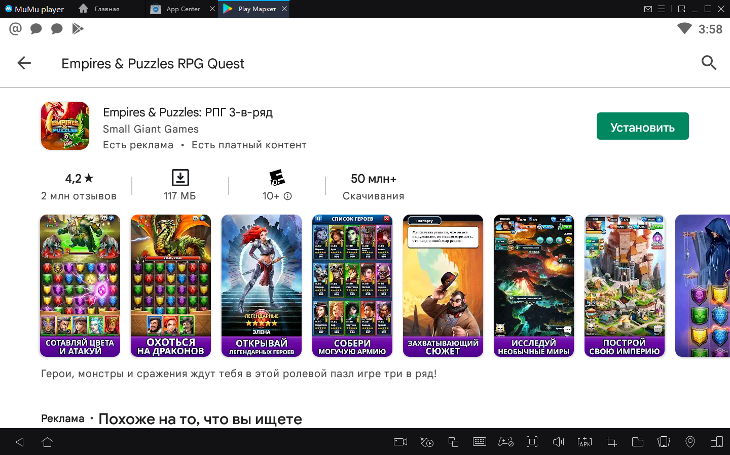 2. Завершите вход в Google и найдите Empires & Puzzles: РПГ 3-в-ряд в Play Store.