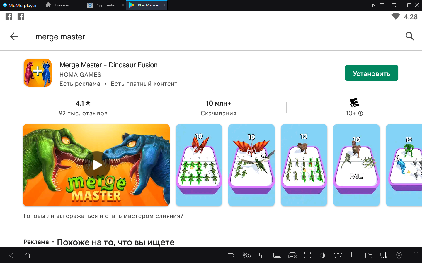 2. Завершите вход в Google и найдите Merge Master - Dinosaur Fusion в Play Store.