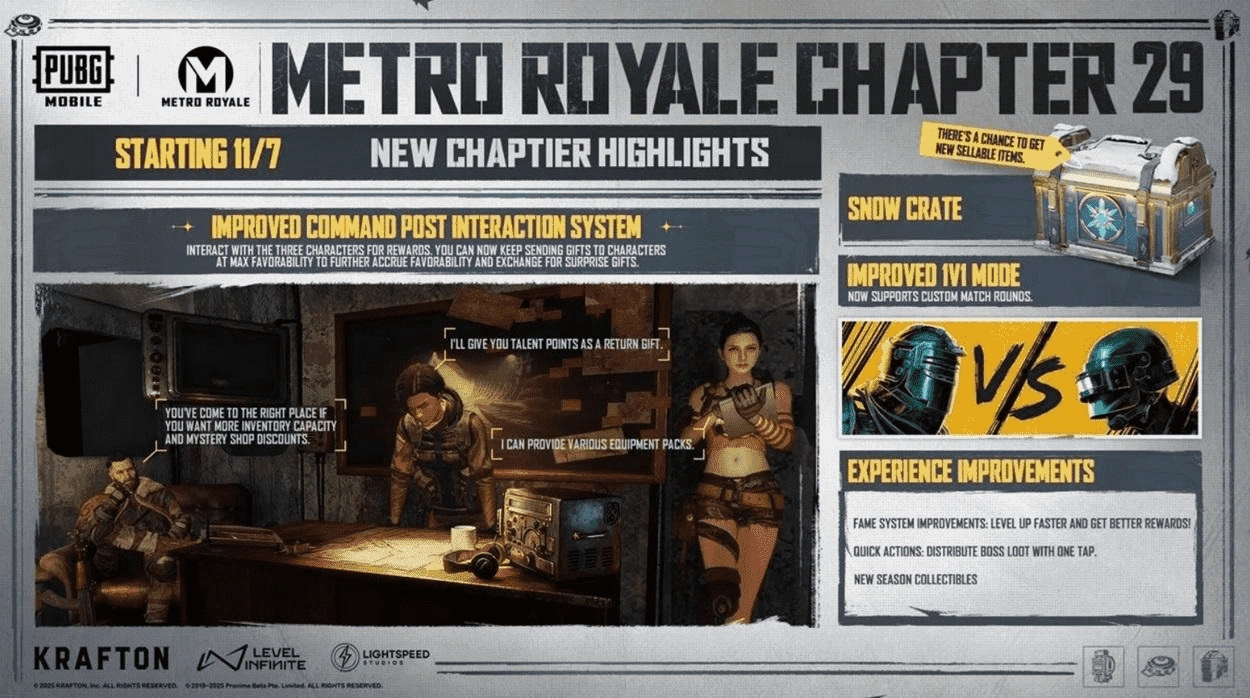 Глава 29 в PUBG Mobile Metro Royale — отличное время для повышения уровня. Благодаря новой системе славы (Fame system), снежным ящикам (Snow Crates) и циклам «риск-награда», версия 4.1 определенно стала лучшим обновлением на данный момент.