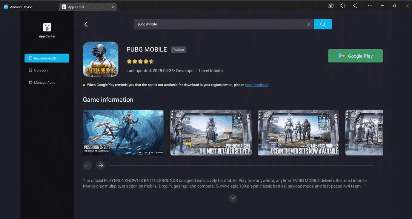 Выполните вход в аккаунт Google и найдите PUBG Mobile в App Center.