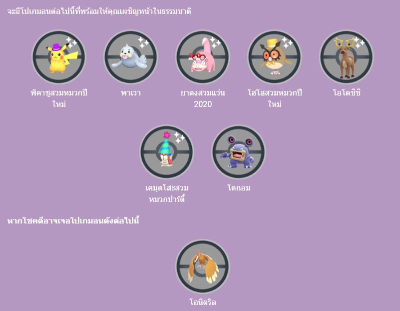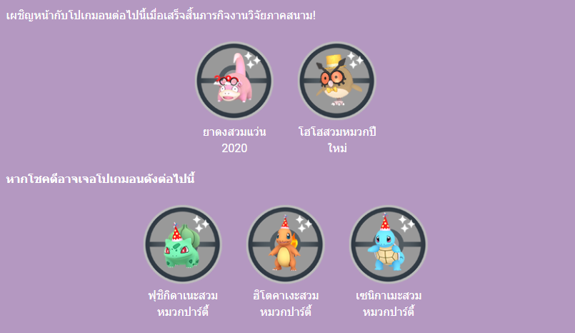 เพื่อเป็นการฉลองปีใหม่ คุณจะสามารถทำงานวิจัยแบบจำกัดเวลาซึ่งจะมีโปเกมอนที่ปรากฏในอีเวนต์นี้