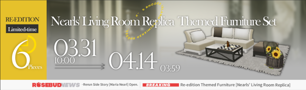 ชิ้นส่วนเฟอร์นิเจอร์ของชุดเฟอร์นิเจอร์นี้จะวางจำหน่ายที่ร้านตั้งแต่วันที่ 31 มีนาคม 2022, 10:00 น. (UTC-7) – 14 เมษายน 2022, 03:59 น. (UTC-7)