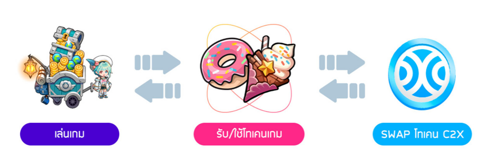 ในขณะเดียวกันก็ได้เปิดตัว ค่าเงินพิเศษ ที่สามารถหาได้จากการเล่นคอนเท้นท์ต่างๆ ได้แก่ “พาร์เฟต์” และ “โดนัท” และในทาง Tokenomic ของเกมจะมี ‘ILT’ เป็น Game Token ประจำเกม และ C2X เป็น Governance Token ผู้เล่นทั่วโลก (ยกเว้นบางประเทศเช่น เกาหลี) สามารถสัมผัสการเล่นในระบบ P2O (Play to Own) จากกการพัฒนาต่างๆในเกมได้ด้วย !