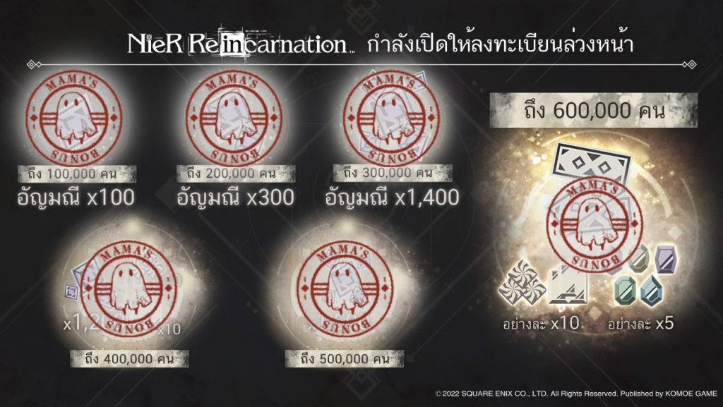 ● เมื่อบรรลุเป้าหมายการลงทะเบียนล่วงหน้าทั้งหมด หลังเปิดเซิร์ฟเวอร์จะมอบรางวัลโบนัสสุดหรูให้!
