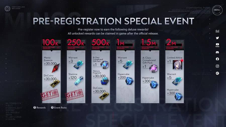 และนอกจากการเผยภาพตัวละครใหม่ออกมาแล้ว ตัวเกมยังได้มีการแจกรางวัล B-Class Crimebrand Gift Pack, 30,000 Discoins และ 30,000 Memory Fragment สำหรับผู้ลงทะเบียนล่วงหน้าตามแคมเปญที่เคยได้มีการประกาศไปก่อนหน้าด้วย และก็จะมีการแจกรางวัลเพิ่มเติมเป็น Limited Attire ให้ฟรี หากมียอดผู้ลงทะเบียนล่วงหน้าทะลุ 2,000,000 ราย