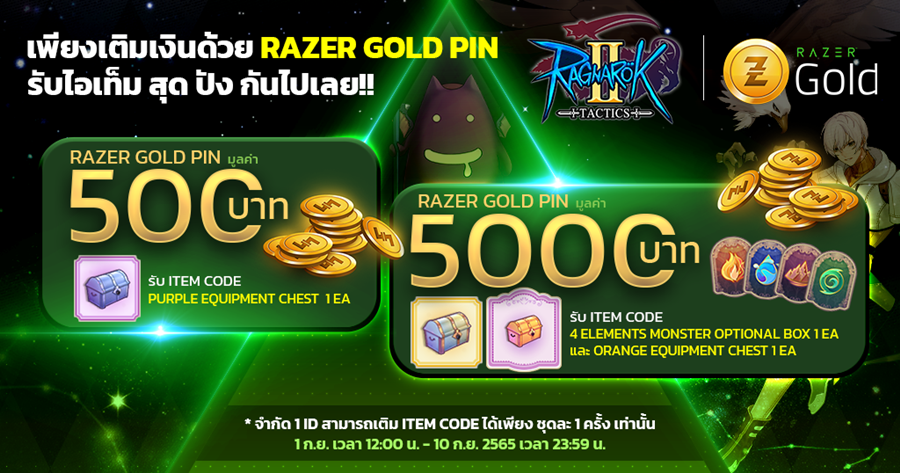 พร้อมโปรโมชั่นเอาใจเหล่านักพจญภัยกับโปรโมชั่นเติมเงิน RAGNAROK TACTICS 2 x RAZER GOLD PIN