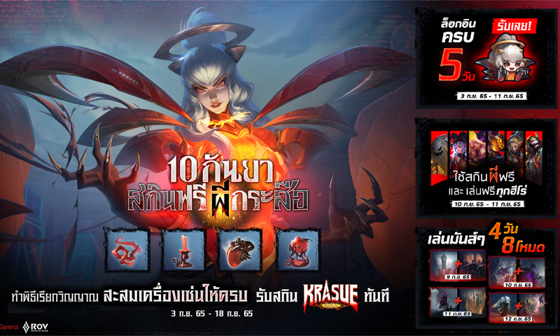 มาตีป้อมปลุกความหลอนไปด้วยกัน เพราะ RoV เปิดให้เล่นสกินผี แถมเล่นฮีโร่ฟรีทุกตัว ให้ผู้เล่นได้มาสัมผัสความหลอนกันให้ถึงขีดสุด ตั้งแต่ 10 ก.ย. 2565 – 11 ก.ย. 2565