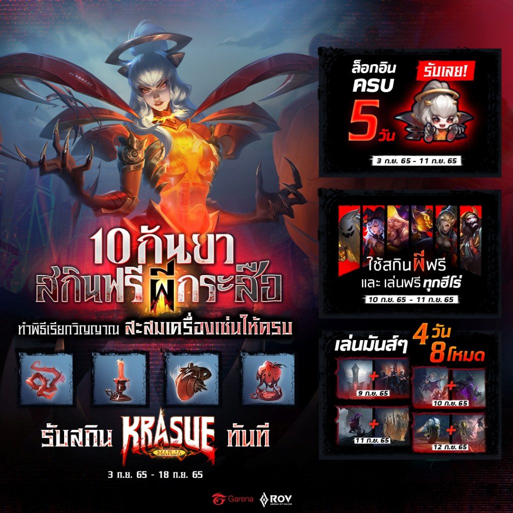 ขอชวนชาว RoV มาทำพิธีเรียกกระสือเพื่อรับสกิน Krasue Marja ถาวรฟรี เพียงสะสมเครื่องเซ่นสำหรับอัญเชิญผีกระสือให้ครบ 16 ชิ้น เอามาแลกสกินใหม่ Krasue Marja ได้เลย ระยะเวลากิจกรรม 3 ก.ย. 2565 – 11 ก.ย. 2565