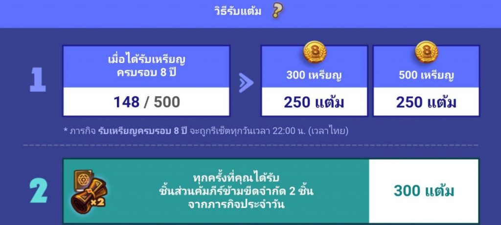 – เมื่อได้รับเหรียญครบรอบ 8 ปี 500 เหรียญ = 250 แต้ม