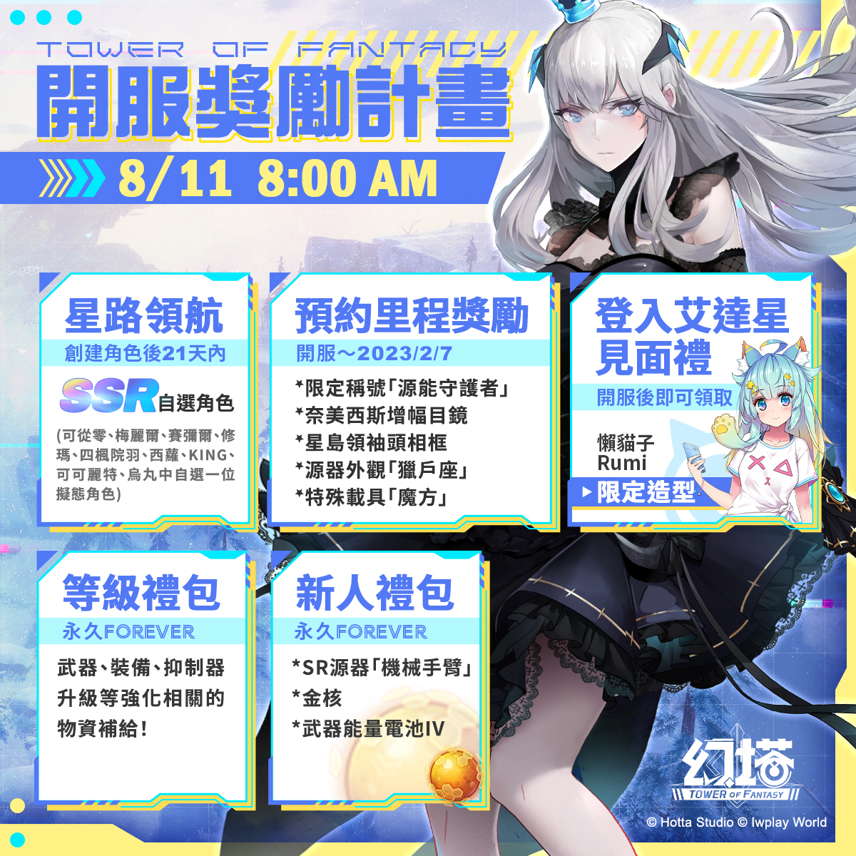 官方表示,日前正式開跑的「玩幻塔送電費」活動仍在進行中,登入遊戲即可能獲得贊助電費。同時歡慶開服,官方準備了 SSR 自選角色、永久載具活動以及與人氣 VTuber「懶貓子 Rumi」的聯名限定造型,邀請拓荒者一同在《幻塔》展開無縫大世界的探索旅程。