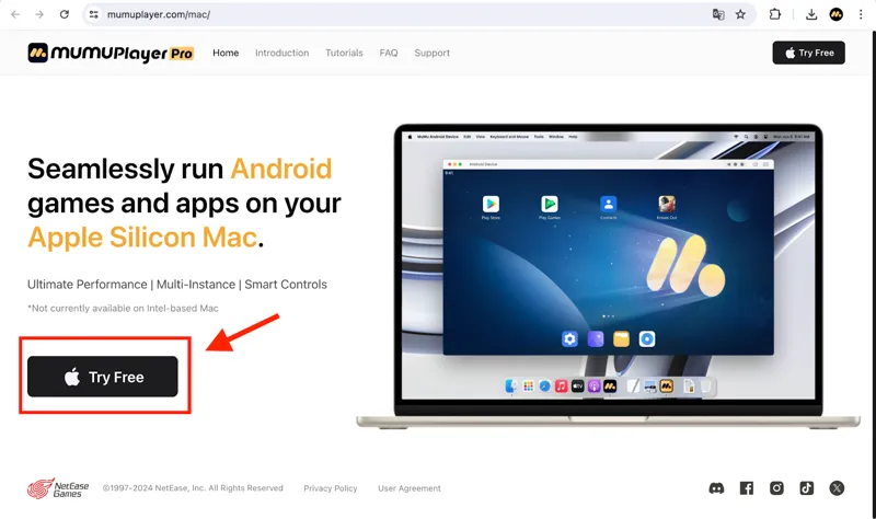 1. 首先,點擊我們的官方網站上的「免費試用」按鈕,安裝 MuMuPlayer Mac 版 並獲得 7 天免費試用。你將會下載一個 dmg 安裝檔案。