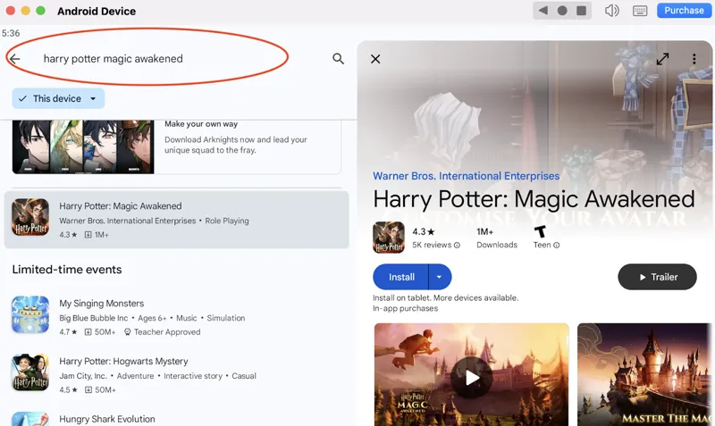 5. 在 Play 商店中搜尋你想要玩的遊戲。例如,這裡我輸入「harry potter magic awakened」。(我們已經在 MuMuPlayer Mac 版 為你下載好 Google Play 商店,所以你不需要自己再下載。)